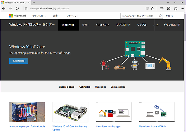 (実態は https://developer.microsoft.com/ja-jp/windows/iot へのリンク)にアクセスして「Get started」をクリックすれば基本的に誰でも簡単に開発環境が構築できるはずである。素晴らしい時代になった。