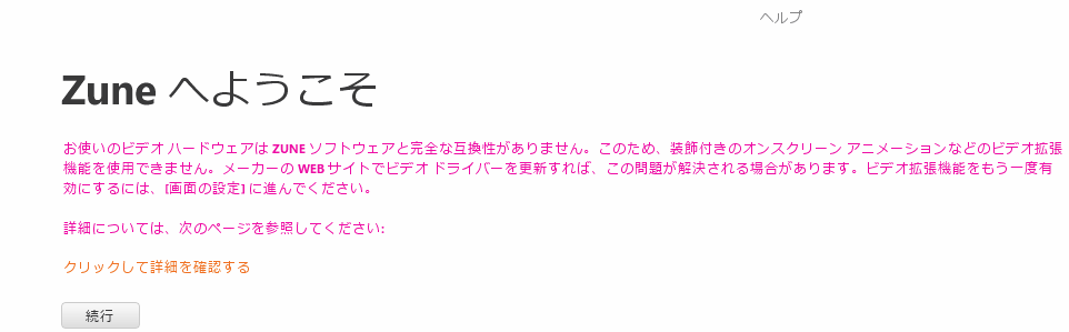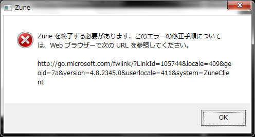 ここで、特定のWindows 7のマシン環境ではZuneソフトウェアがうまく起動しないという問題が発生することがわかった。正確には、起動するのだが次のようなダイアログを出力して終了してしまうという問題だ。